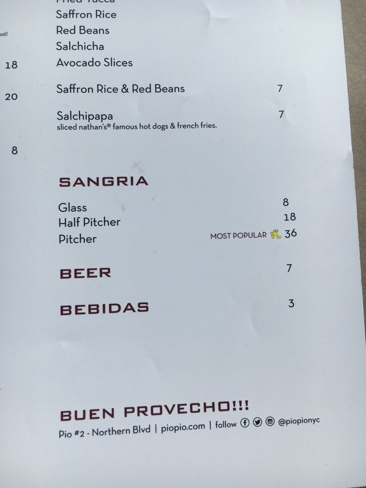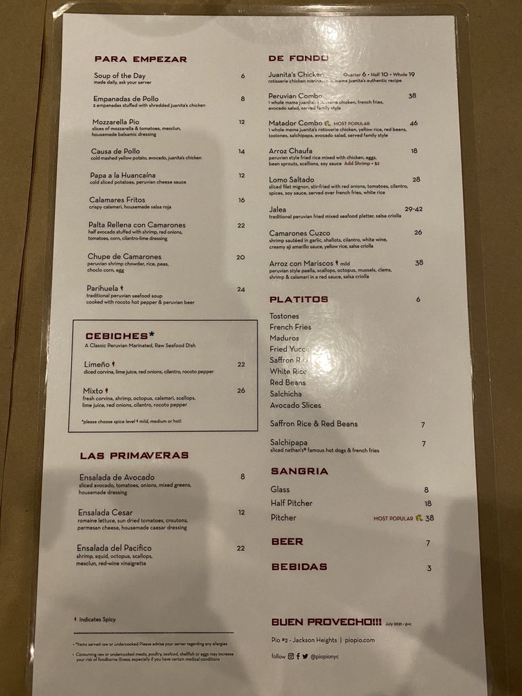 Introducing the menu at Pio Pio 2, a Latinx-owned restaurant in Jackson Heights, NY, offering a range of flavorful dishes. With options like empanadas de pollo, arroz chaufa, sangrias, Jaunitas chicken, lomo saltado, and ceviche, this spot is a favorite for many. The atmosphere is casual and lively, perfect for gatherings with friends or family. Customers rave about the tender chicken, flavorful salsa verde, and irresistible saffron rice. The menu features generous portions, ensuring you'll leave satisfied or with leftovers to enjoy later. Don't miss out on the refreshing sangrias and delectable lucuma ice cream. Pio Pio 2 promises a warm welcome and a truly memorable dining experience.